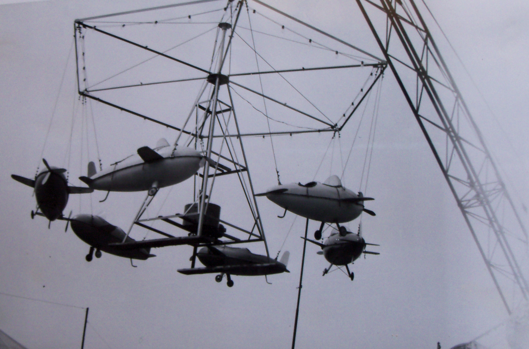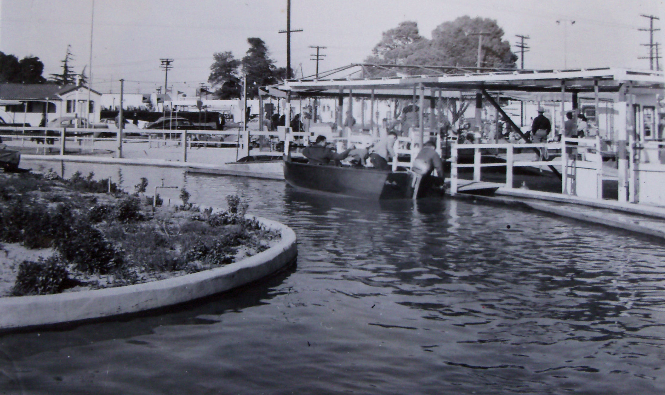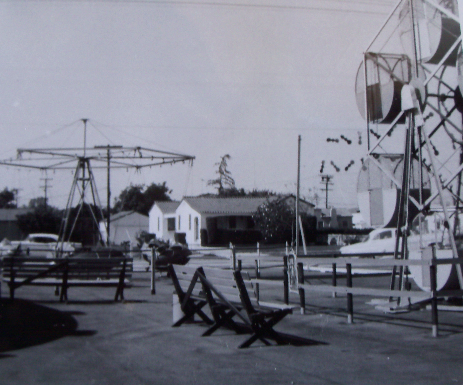 Matt constructed several of the smaller rides in his front yard on Tamarind in Compton. The airplane and car rides, and an early chariot ride, may have been moved to Tiny Town from there. I remember a swing ride, simple metal seats on chains, clearly made from scratch. Like the airplanes, centrifugal force was the attraction here. The Tiny Town Ferris wheel, tiny though it seemed, even then, was a chance for a child to safely go up high and look down on what we called ‘the lot’. The aforementioned rides, and the indoor boat ride comprised the smaller rides, suitable for little children.